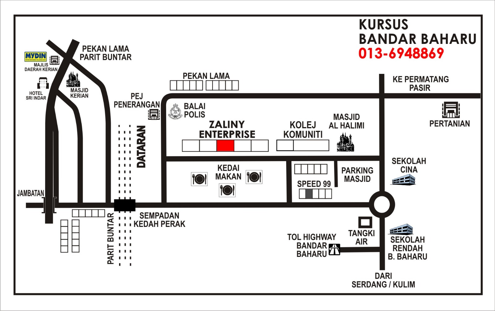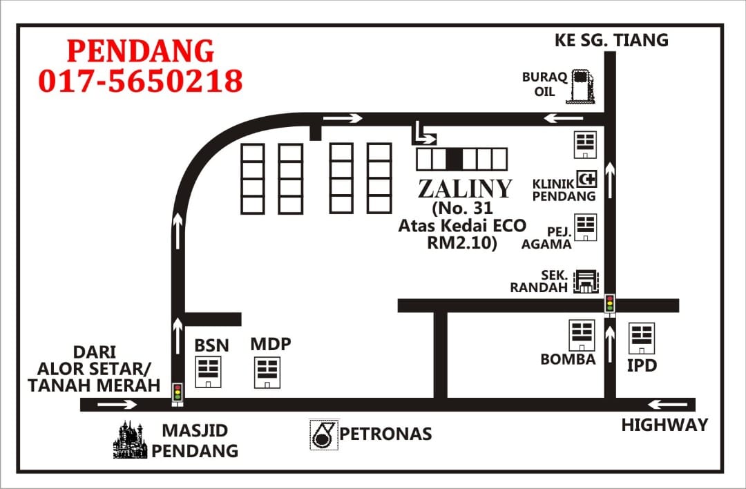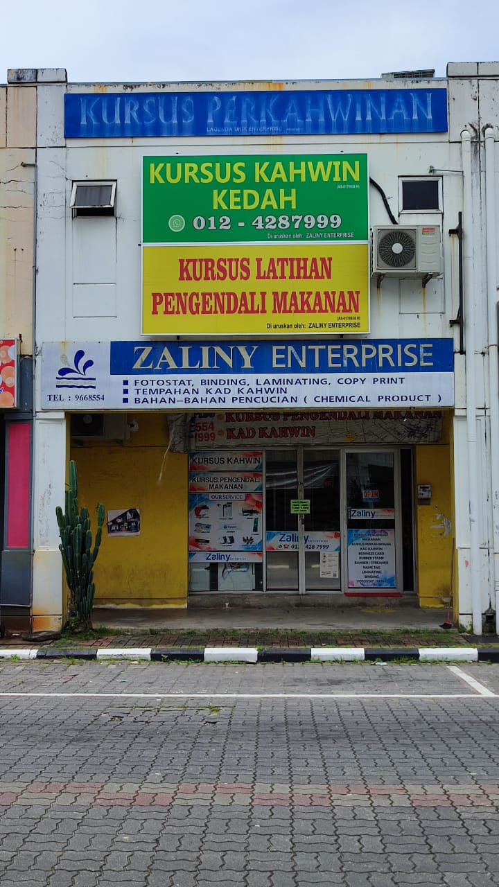 Alor SetarZaliny Enterprise No. 953, Bangunan Peruda Baru, Jalan Sultan Badlishah, 05000 Alor Setar, Kedah Sungai PetaniZaliny Enterprise No. 14, Jalan PPZ 1, Pusat Perniagaan Zamrud, 08000 Sungai Petani, Kedah KulimZaliny Enterprise No. 8 B Bangunan Rumah Kedai Masjid Jamiul Makmur, Jalan Bukit Awi, 09000 Kulim, Kedah JitraZaliny Enterprise No. 13 Tingkat Atas Pekan Jitra 3, 06000 Jitra, Kedah (Bersebelahan Pakaian Hari-Hari) LangkawiZaliny Enterprise DEWAN ZALINY LANGKAWI Arked Pokok Asam 1, 07000 Langkawi, Kedah (Lorong Trafik Light & belakang KFC kuah) PendangZaliny Enterprise KURSUS KAHWIN PENDANG NO.31A, JALAN SUKAMARI, TAMAN SUKAMARI, 06700 PENDANG, KEDAH Guar ChempedakZaliny Enterprise NO 2C BANGUNAN ORKED UTAMA, JALAN YAN GUAR CHEMPEDAK, 08300 GURUN, KEDAH BalingZaliny Enterprise 34-A3 Kompleks Koperasi Pasar Melayu Baling Berhad, 09100 Baling, Kedah Bandar BaharuZaliny Enterprise No. D2 Tingkat Atas, Kedai 2 Tingkat 34950 Bandar Baharu, Kedah ChanglunZaliny Enterprise 72B, Pekan Changlun, Taman Kempas, 06010 Changlun, Kedah Kuala KetilZaliny Enterprise Bangunan Koperasi, Sebelah Masjid, Taman Permai, 09300 Kuala Ketil, Kedah JejawiZaliny Enterprise No 37, Tingkat 1, Kompleks Bazar MPK Jejawi, 02600 Arau, Perlis Sijil dikeluarkan oleh